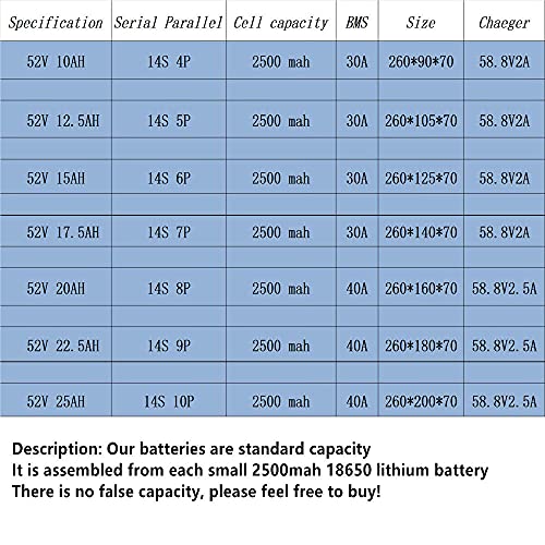 Grootte en specificatie: 52v10AH (14S4P) / 12.5AH (14S5P) / 15AH (14S6P) / 17.5AH (14S7P) / 20AH (14S8P) / 22.5AH (14S9P) / 25AH (14S10P), Grootte Controleer alstublieft de chique van de maat, alstublieft Koop de verkeerde niet.