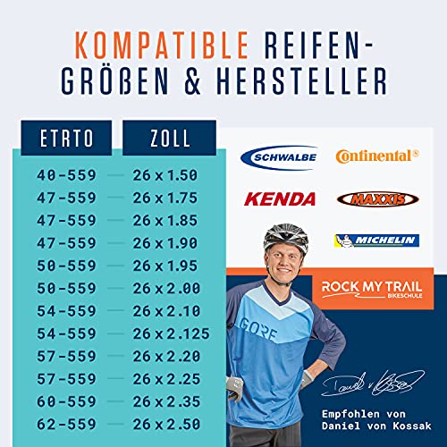 GESCHIKTE BANDENMATEN – Onze binnenband is geschikt voor gebruik met de volgende buitenbanden: 40-559 (26 x 1.50), 47-559 (26 x 1.75), 47-559 (26 x 1.85), 47-559 (26 x 1.90), 50-559 (26 x 1.95), 50-559 (26 x 2.00), 54-559 (26 x 2.10), 54-559 (26 x 2.125), 57-559 (26 x 2.20), 57-559 (26 x 2.25), 60-559 (26 x 2.35), 62-559 (26 x 2.50). De grootte wordt aangegeven op de zijkant van de band.