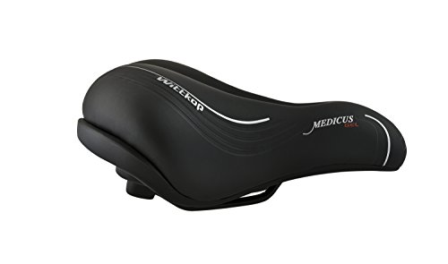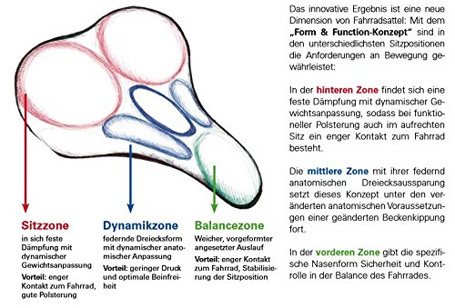 Medicus Citta zadel met gel, anatomisch geoptimaliseerde zadel voor alle gangbare tochten en stadsfietsen Speciaal ontwikkeld anatomisch ontwikkelde 3-zone ontwerp voor een goede grip en comfortabel, ontspannen zitten, ook op langere afstanden. Al meer dan 10 jaar Instructor van de Duitstalige Werkgemeenschap voor arthroscopie en sinds 15 jaar lid van de Europese vereniging van sportorthopädie, ontwikkelde hij samen met Wittkop het concept voor dit zadel. Balancezone: in de voorste zone geeft de specifieke neusvorm veiligheid en controle in de balans van de fiets Dynamikzone: de middelste zone met zijn verende anatomische driehoekuitsparing zet dit concept onder de gewijzigde anatomische omstandigheden van een gewijzigde bekkenwiel fort zitzone: in de achterste zone bevindt zich een vaste demping met dynamische gewichtsaanpassing, zodat bij functionele bekleding ook rechtop zit. Nauw contact met de fiets bestaat uit comfortabele vering door gel-inzetstukken, extra bekleding.