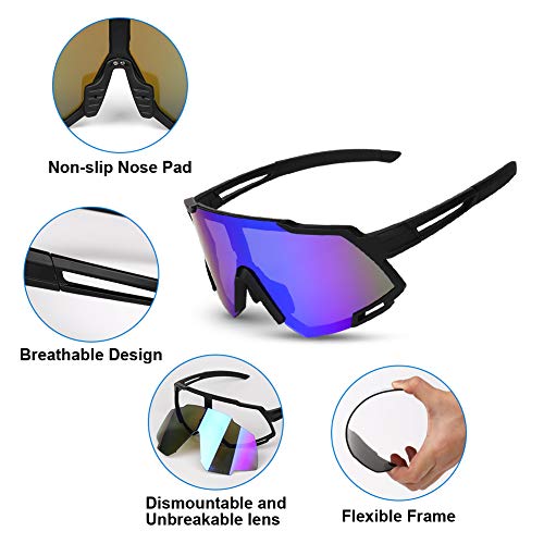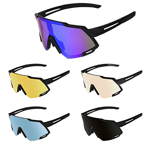 [5 verwisselbare lenzen] De fietsbril wordt geleverd met vier extra lenzen, in totaal vijf lenzen. Ze zijn een gele lens voor gebruik in de nacht, een blauwe lens om te gebruiken in luchtvervuiling of mistige conditie, een grijze gepolariseerde lens voor UV-bescherming, en een anti-verblinding en transparante lens die wordt gebruikt bij wind en regen.