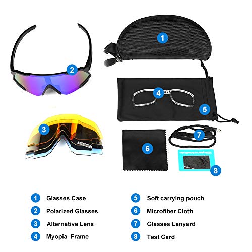 [Alle accessoires] Deze gepolariseerde fietsbril wordt geleverd met alle accessoires die nodig zijn, zoals een brillenetui, een zachte draagtas voor gemakkelijk uitnemen, microvezeldoek om te reinigen. Eén brillenkoord en een bijziendheid frame voor meerdere doeleinden, en één testkaart.