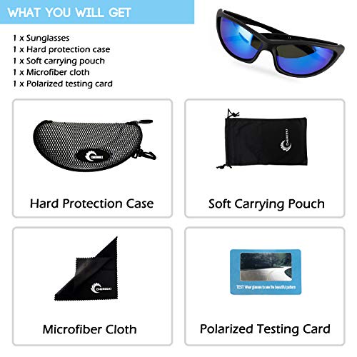Pakket inbegrepen: 1, een harde beschermhoes met een clip die u aan een rugzak of wat u maar wilt kunt bevestigen, bied uw zonnebril aan; 2, een zachte draagtas maakt het handig voor dagelijks gebruik; 3, een microvezeldoek voor gemakkelijk schoon te maken; 4, een gepolariseerde testkaart
