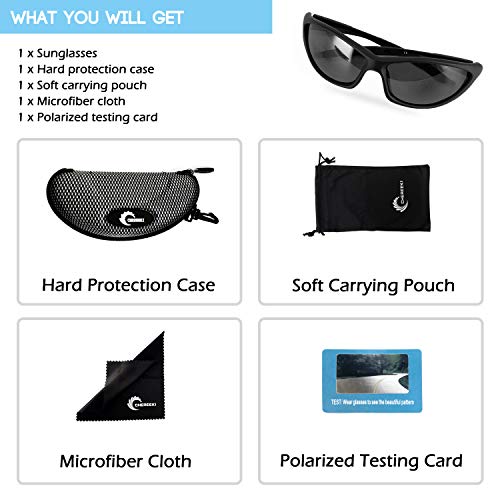 Pakket inbegrepen: 1, een harde beschermhoes met een clip die u aan een rugzak of wat u maar wilt kunt bevestigen, bied uw zonnebril aan; 2, een zachte draagtas maakt het handig voor dagelijks gebruik; 3, een microvezeldoek voor gemakkelijk schoon te maken; 4, een gepolariseerde testkaart