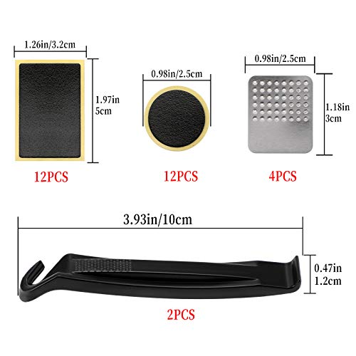 Het pakket bevat: je ontvangt 30 reparatiesets voor fietspanen, waaronder 12 ronde lijmloze patches en 12 rechthoekige patches en 4 metalen raspen, 2 plastic bandenhendel en een opbergdoos. Een voldoende hoeveelheid kan aan je bandenreparatiebehoeften voldoen.